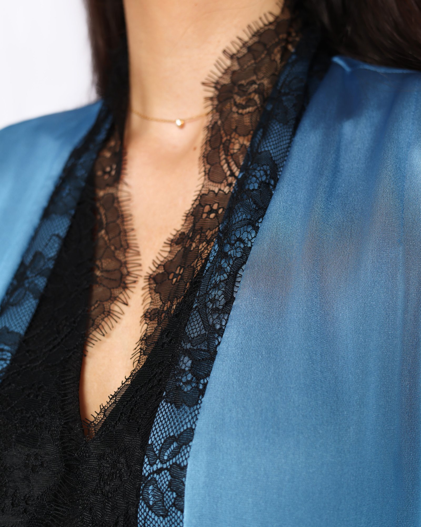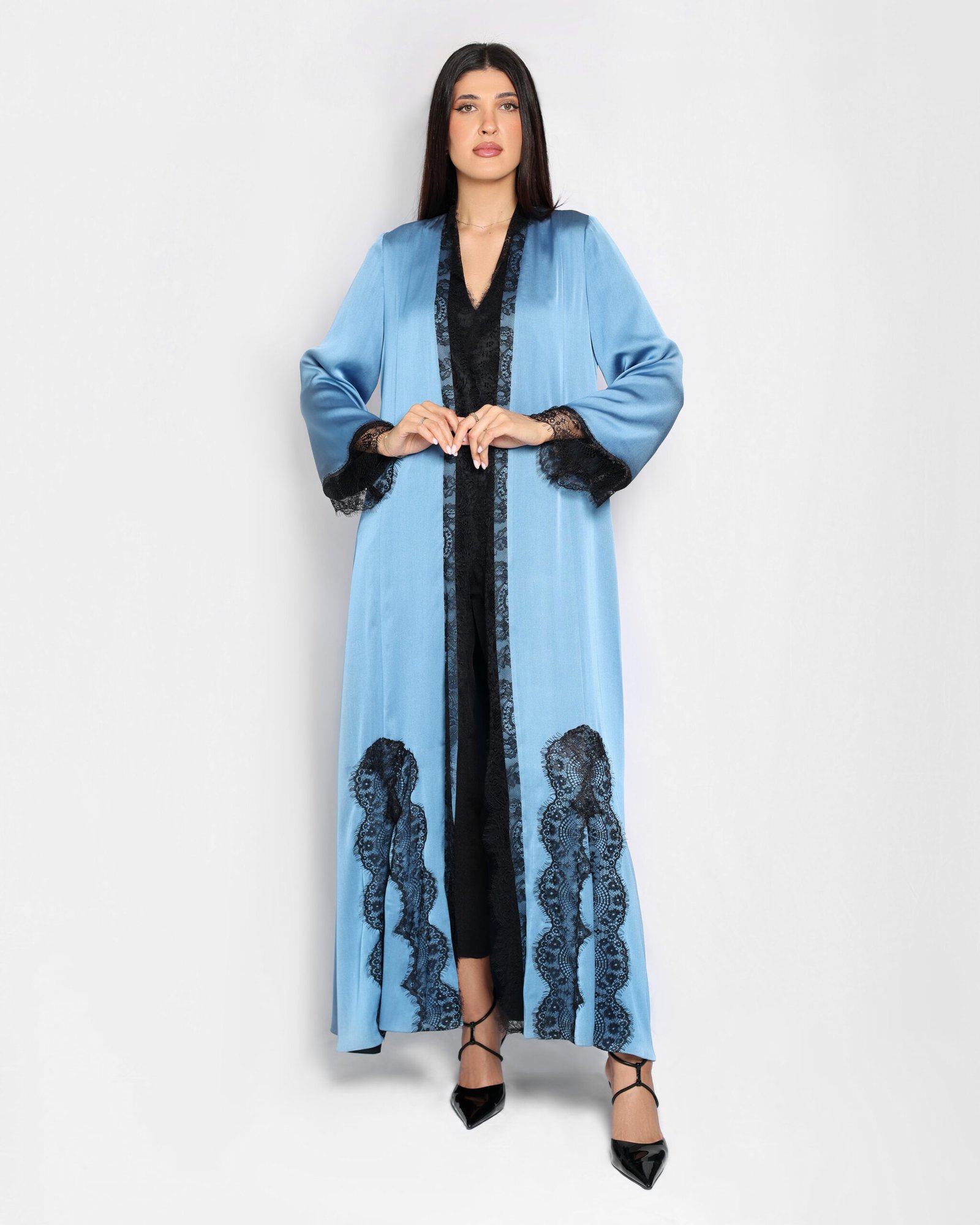A refined expression of contrast and fluid elegance, Azur is crafted from luxurious two-tone silky fabric in deep blue and black. Delicate French black lace details frame the silhouette, adding depth, texture, and a touch of timeless sophistication. Gracefully flowing with every movement, Azur is designed for luminous evenings and serene Ramadan gatherings. Modern contrast. Effortless elegance. Quiet radiance.